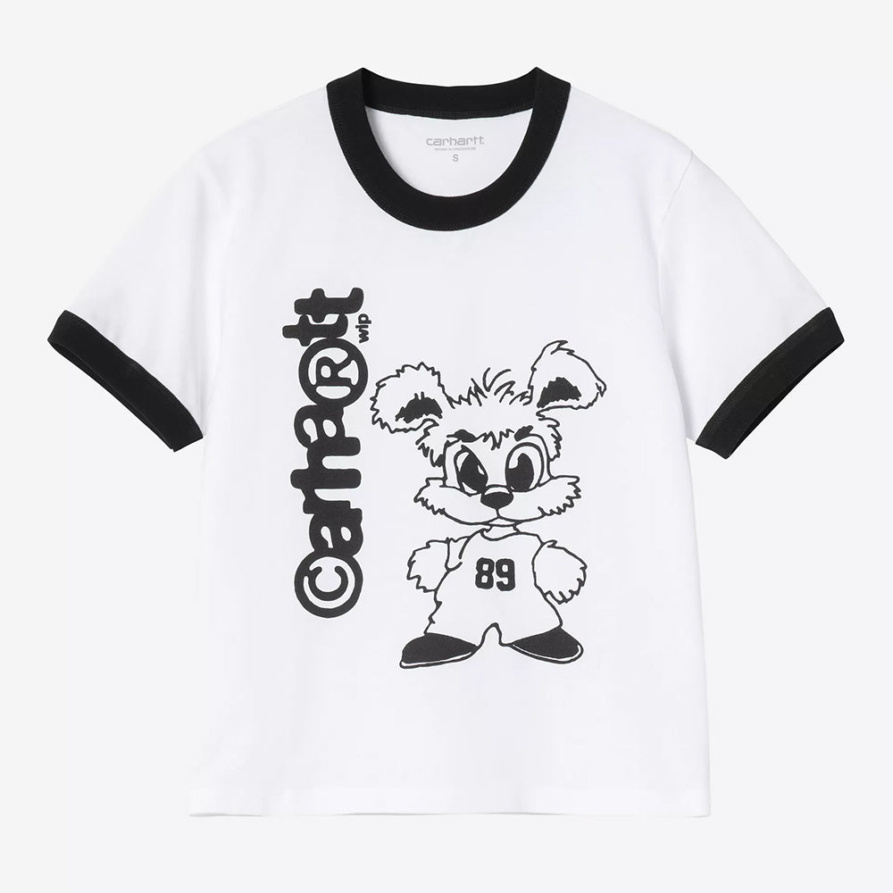 The Women's S/S IP Ringer T-Shirt is made in a slim fit from a midweight organic cotton jersey, featuring contrasting ribbed trims. A graphic print appears on the chest.