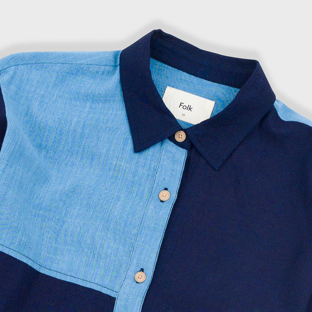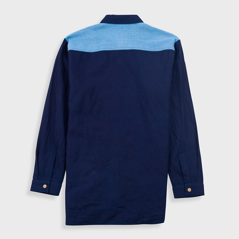 We've constructed this garment in tonal blue cotton patches, made with a hand-woven fabric from India that has been dyed in real indigo. This garment will feature irregular slubs and weaving marks that are characteristic of hand-loomed fabrics, adding uniqueness to each shirt.