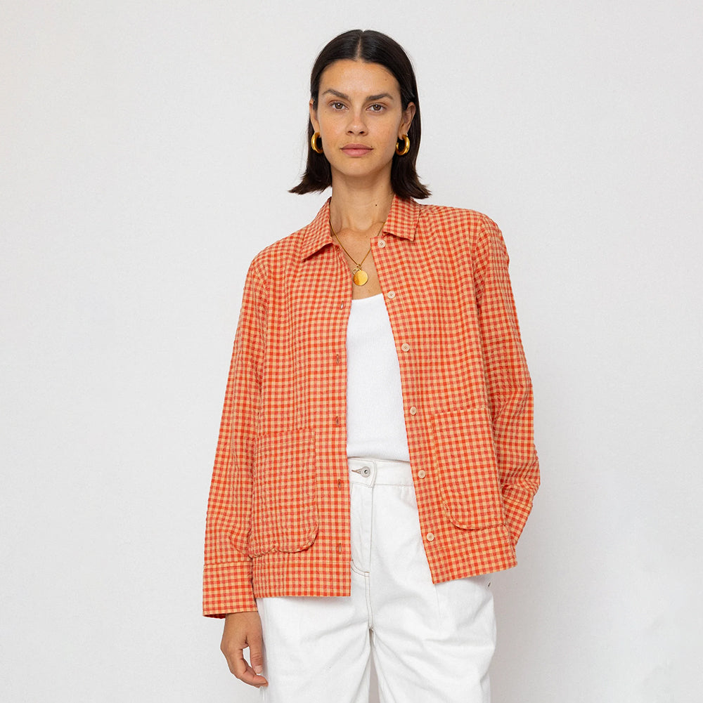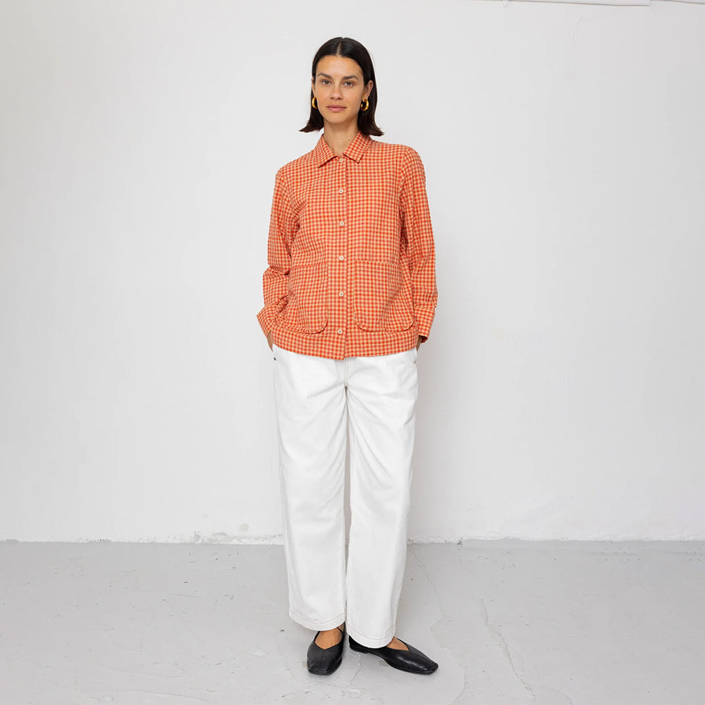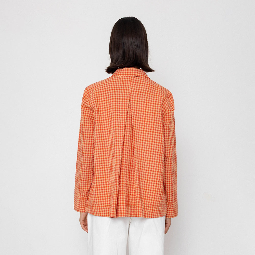 Relaxed boxy fit shirt in a lightweight cotton gingham check fabric with textured surface.