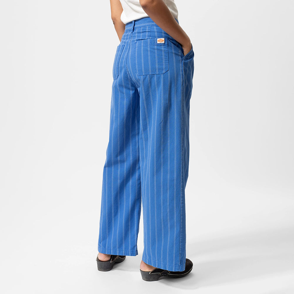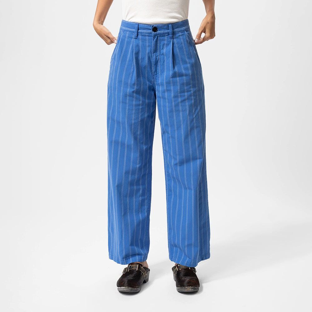 Introducing Gullan – our pleated loose-fit pant in a light blue stripe. Designed with a mid waist and wide leg, these pants are effortlessly elegant. Crafted from a wonderful striped plain weave with a dry, textural crispiness, Gullan strikes the perfect balance between lightweight and sturdy. The plain weave is constructed from irregular ring-spun yarn-dyed yarns, giving Gullan its unique touch and look. Thanks to the patented dyeing process from our supplier, Gullan will age similarly to an indigo garment—slowly brightening in tone and enhancing the fabric's texture. Gullan is exceptional from the start and will become even more beautiful with wear and washing. A garment perfectly suited for tomorrow's vintage. Gullan pairs wonderfully with Kicki—or honestly, any top you throw at it. Gullan is versatile like that.