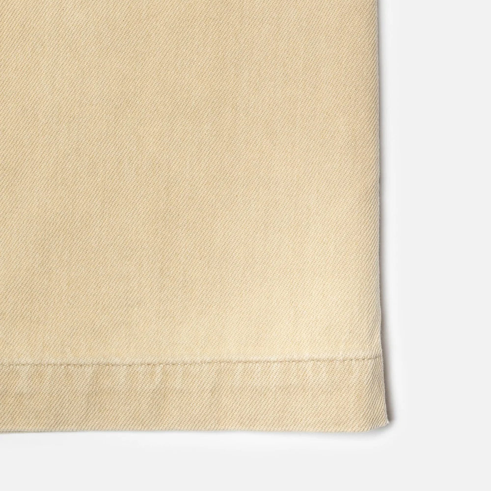 The denim is quite special—its brown warp yarns are dyed with a natural pigment derived from oak acorns, giving the fabric its distinct tone and indigo-like aging property. Crafted from coarse yarns at a medium density, it offers a dry yet comfortable hand with rich texture and just enough flow to feel easy without being soft.