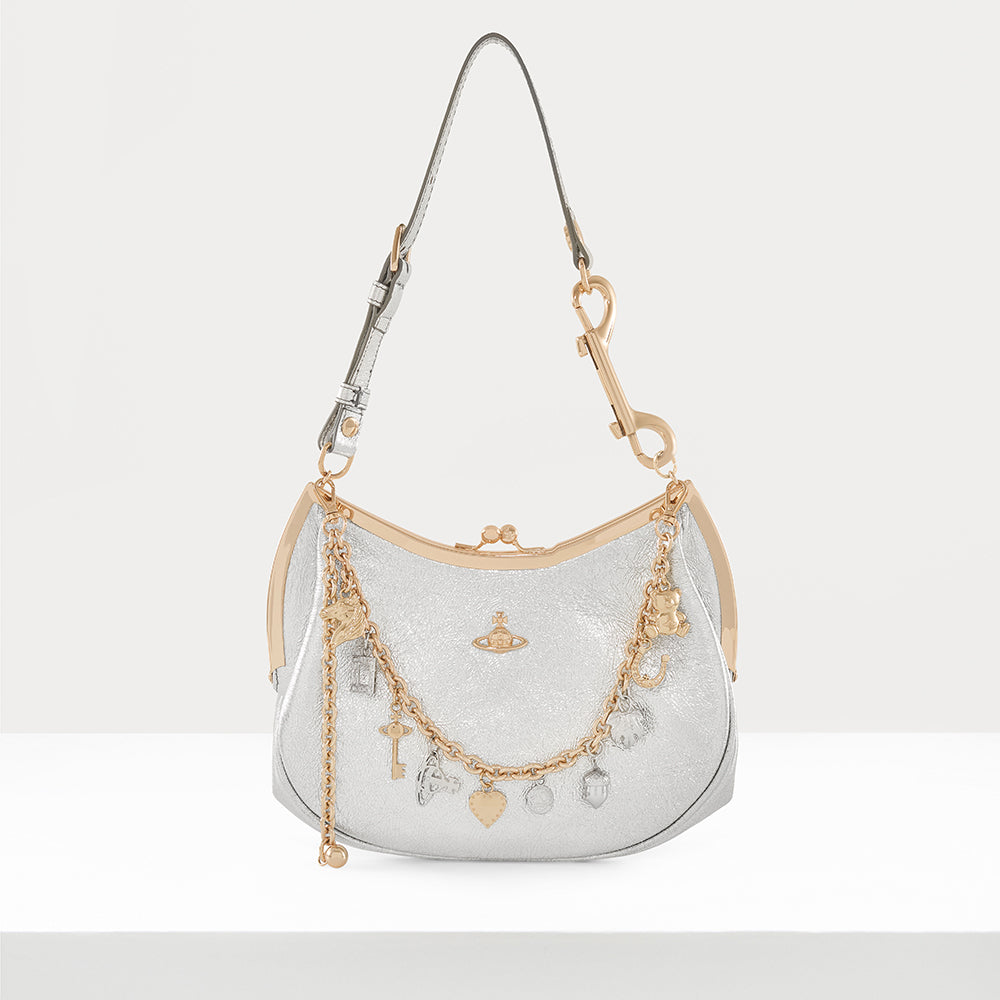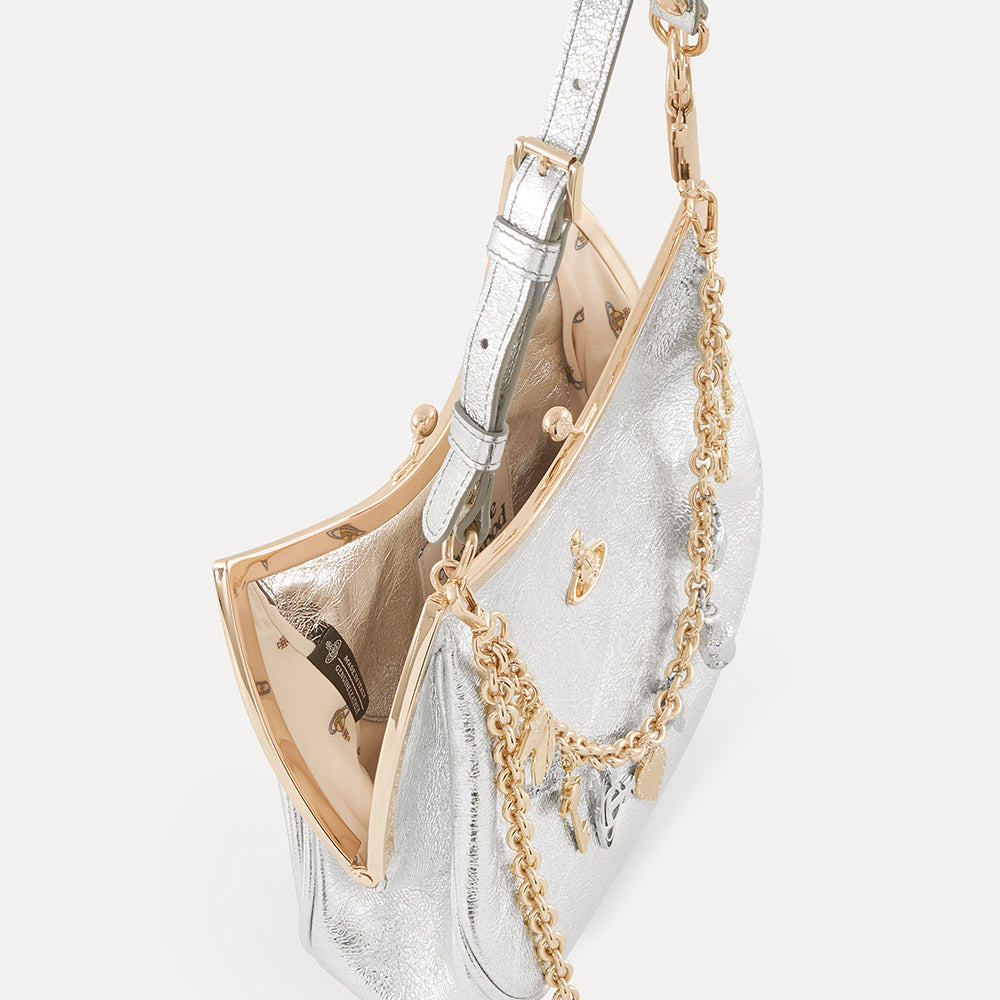 The Charm Frame purse offers a fresh interpretation of the classic Frame purse in a shimmering metallic crinkle-effect leather finish. The piece features a curved metal frame and a custom-made crescent silhouette, adorned with a DIY-inspired dog clip strap and decorative chain detail, complete with iconic motifs from the house's archives.