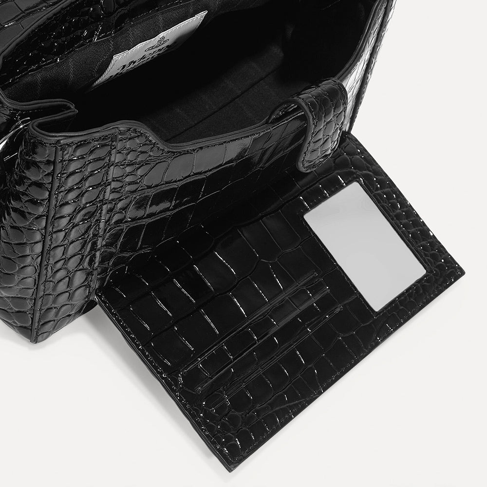 Our signature Hazel Medium handbag returns in this season's shiny leather finish, complete with croc-effect embossing. The piece receives our signature broken pinstripe lining, a unique twist on the traditional pinstripe pattern, first seen in the Vivienne Westwood Gold Label Autumn-Winter 2015 collection.